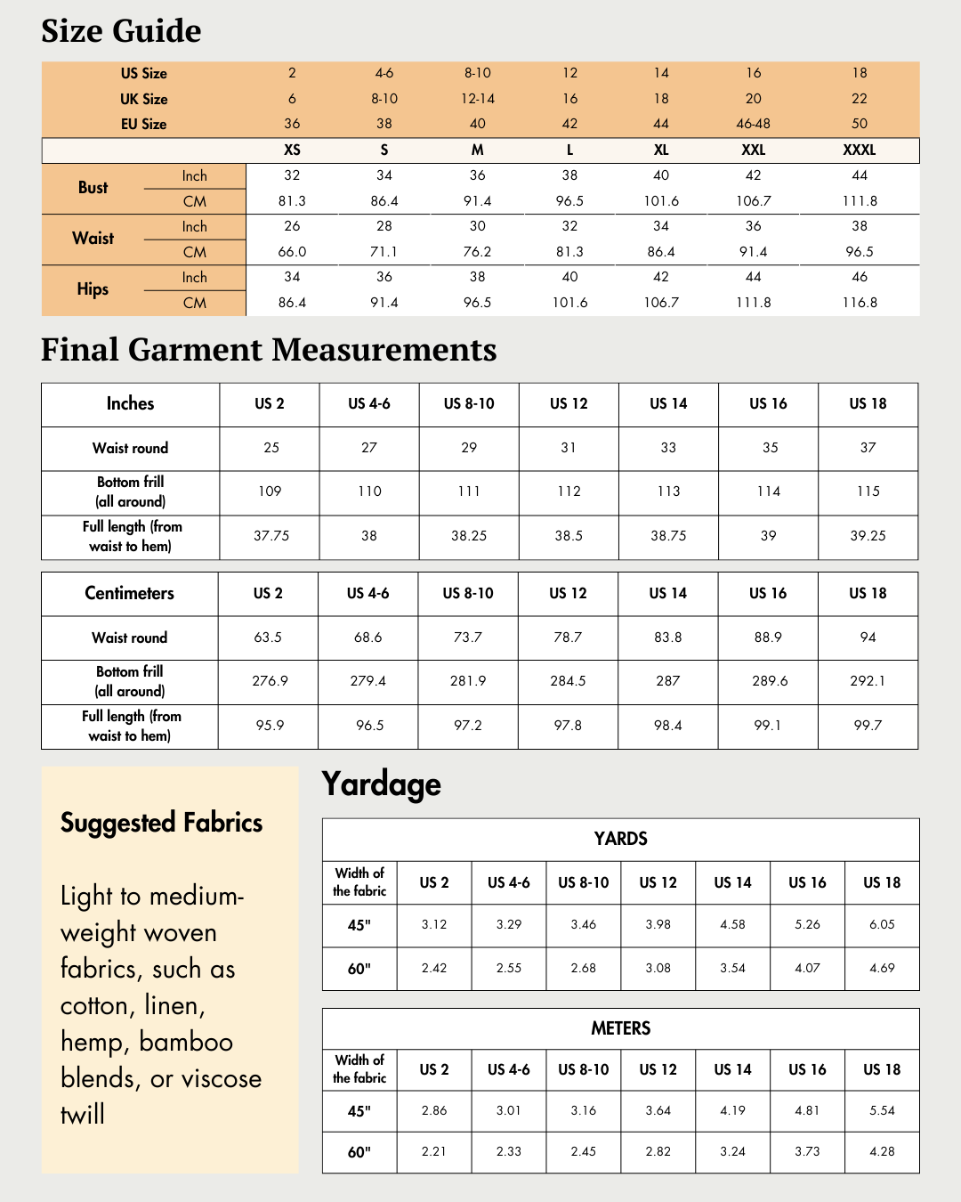 | Seams | Plain seams, neatly finished with a serger or zigzag stitch, or opt for a Hong Kong finish. |