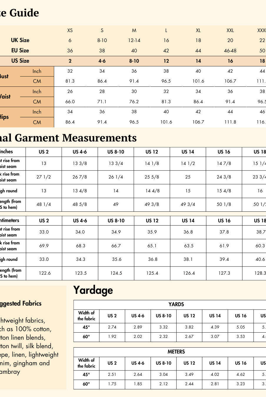 | Waist | 26 | 66.0 | 28 | 71.1 | 30 | 76.2 | 32 | 81.3 | 34 | 86.4 | 36 | 91.4 | 38 | 96.5 |
