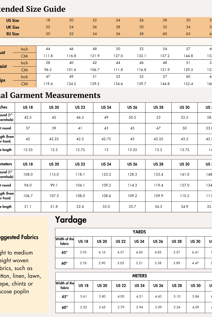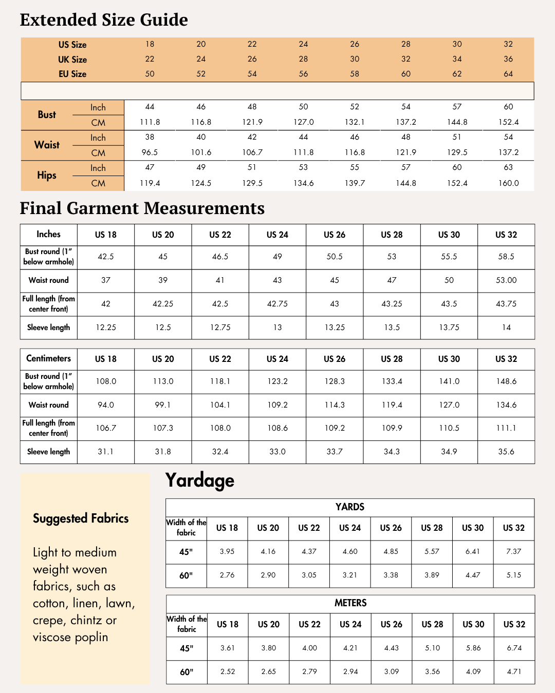 | Bust | 32 | 81.3 | 34 | 86.4 | 36 | 91.4 | 38 | 96.5 | 40 | 101.6 | 42 | 106.7 | 44 | 111.8 |