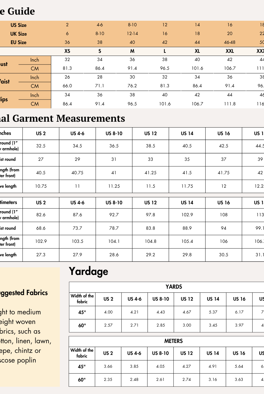| Width of the Fabric | XS (yards) | XS (meters) | S (yards) | S (meters) | M (yards) | M (meters) | L (yards) | L (meters) | XL (yards) | XL (meters) | 2XL (yards) | 2XL (meters) | 3XL (yards) | 3XL (meters) |