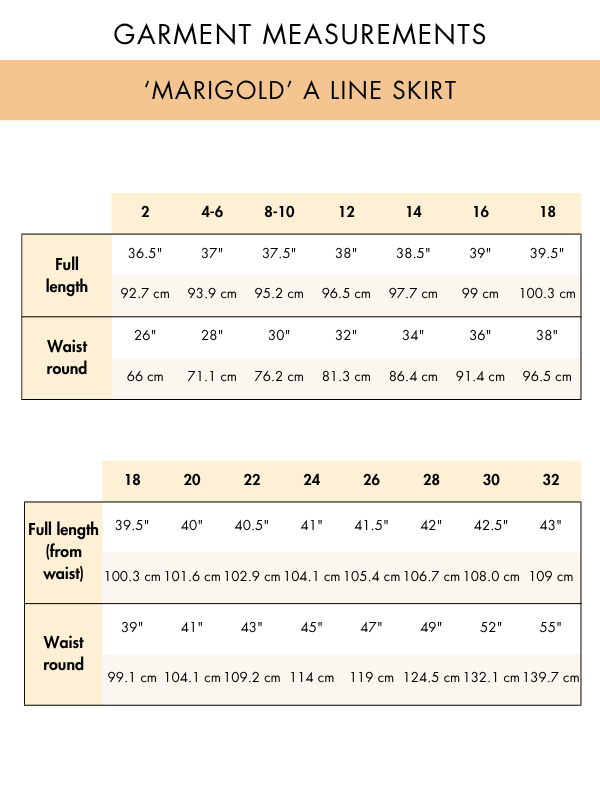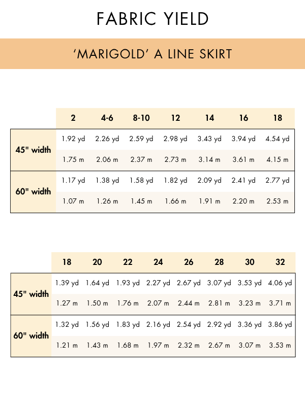 Size guide and fabric recommendations for the 'Marigold' A-line skirt sewing pattern. Includes US, UK, and EU sizes with yardage details.