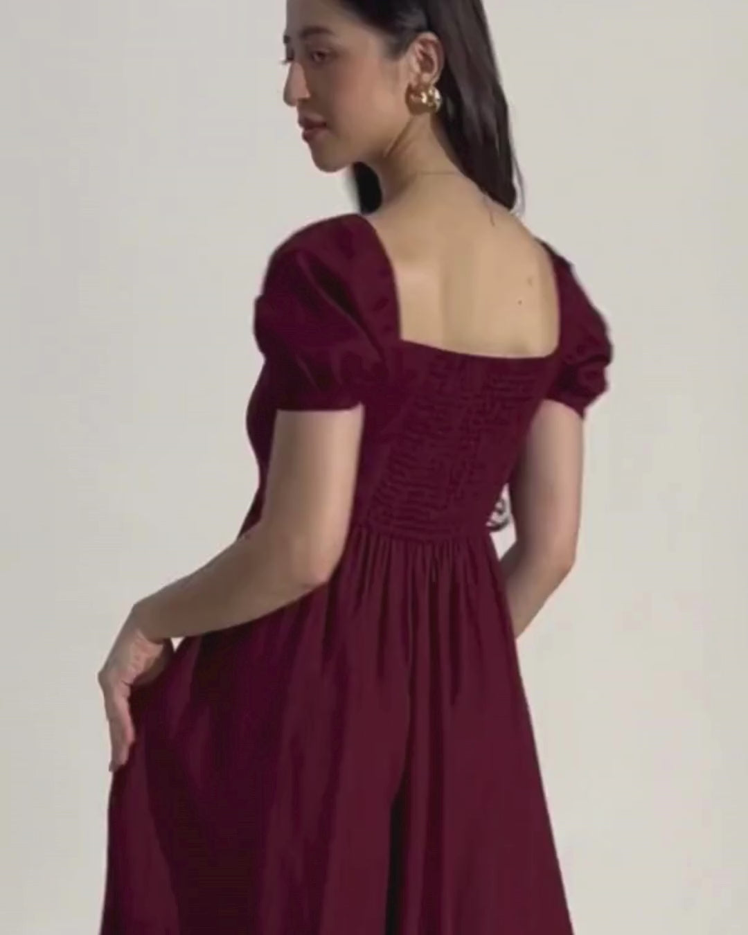 This sewing pattern features a classic midi-length dress with a structured bodice, puff sleeves, and a softly gathered skirt. The square neckline is mirrored at the front and back, and the back bodice includes a smocked elastic panel that ensures a snug yet comfortable fit. The short puff sleeves gather into a narrow band at the hem to maintain shape, while the flowy skirt falls below the knee for a timeless silhouette.