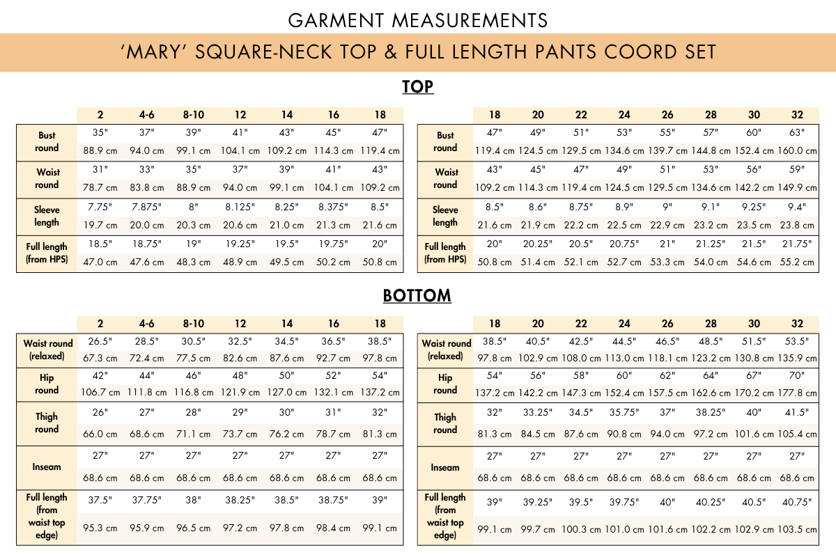 Size chart for top in 'Mary' Coord Set sewing pattern, includes UK, EU, US sizes, body measurements, and fabric yardage suggestions.