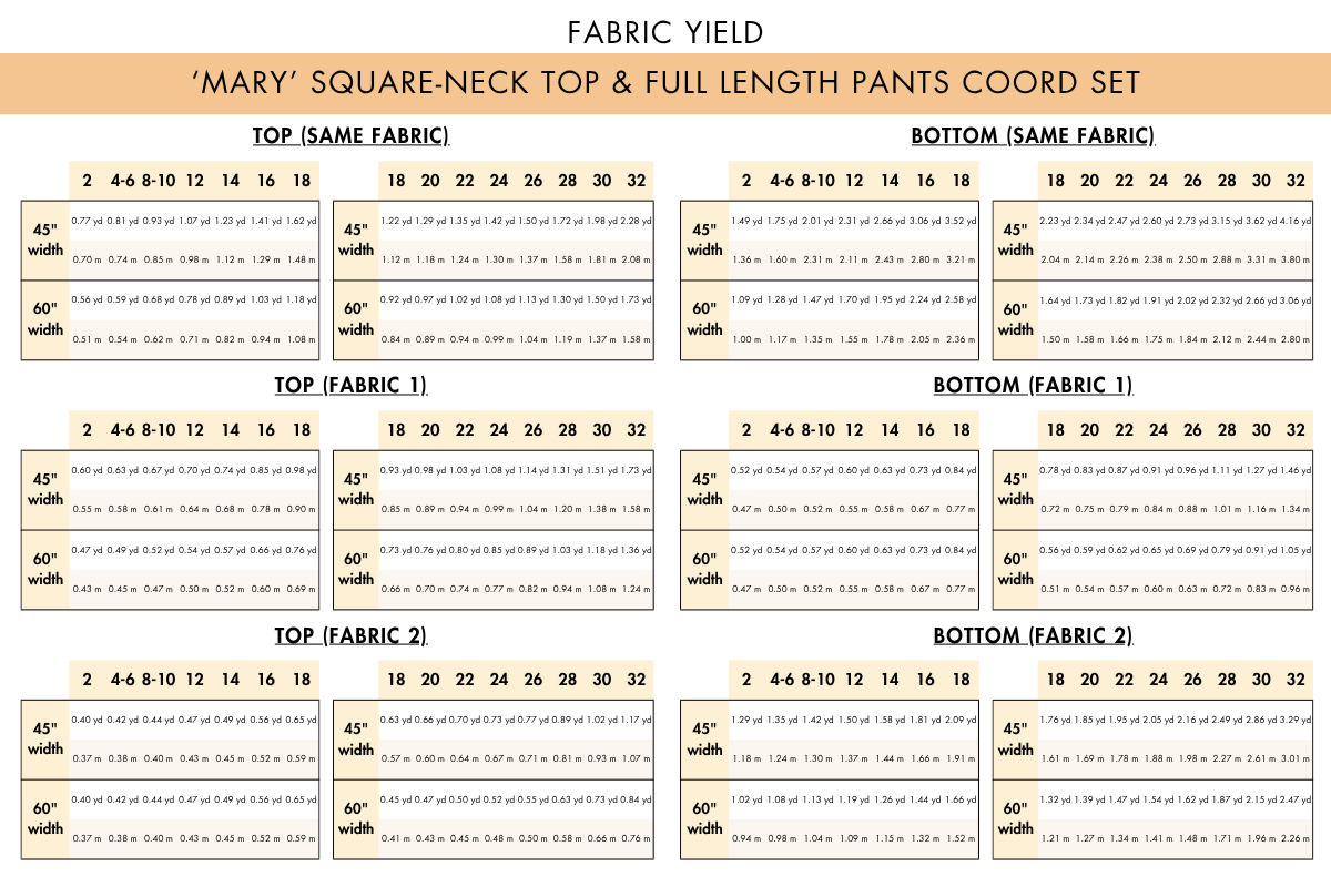 Extended size chart for pants in 'Mary' Coord Set sewing pattern, showing inclusive sizing and fabric yardage in yards and meters.