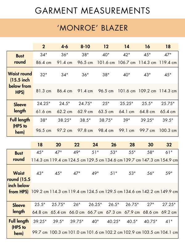 Our sewing patterns are initially designed based on a basic block drafted for a woman with the following measurements: height 5'6", bust 34", and waist 28", corresponding to size S on our size chart. From there, the patterns are graded both up and down to accommodate various sizes.