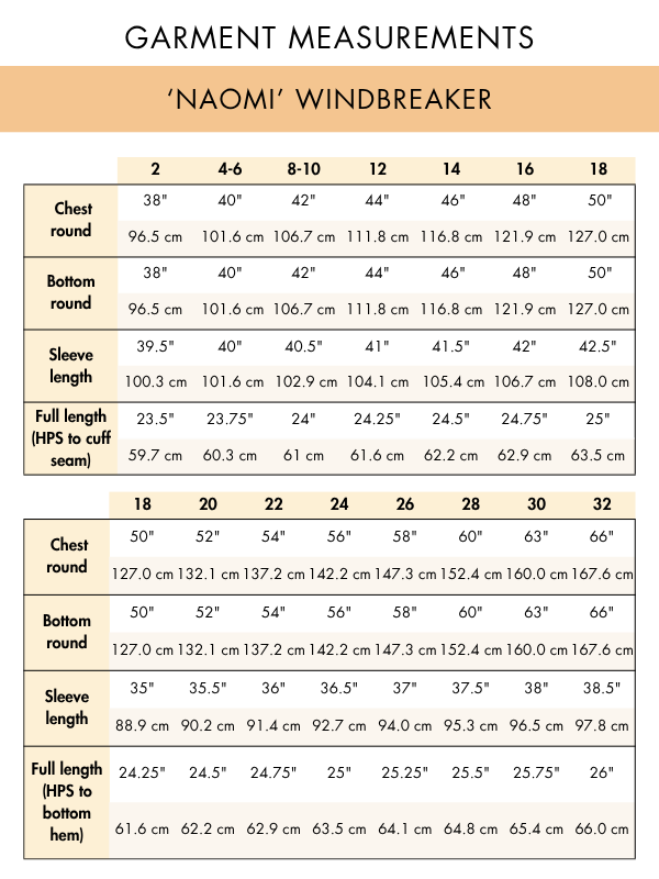 If your measurements fall between sizes, consider the fit you prefer (looser or tighter) and the type of fabric you'll use, as some fabrics have more give. All patterns include finished garment measurements which can be helpful to know how much ease or extra room is built into the design.