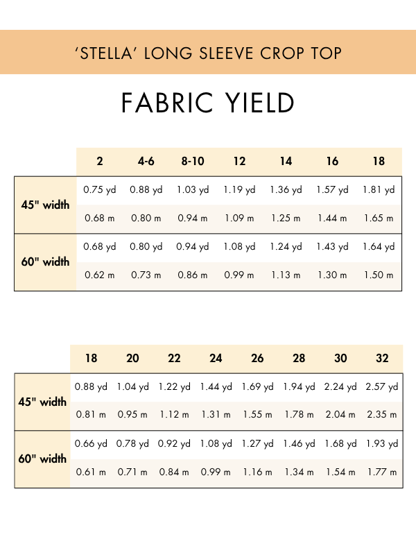 Size guide and fabric recommendations for Stella Long Sleeve Crop Top sewing pattern. Includes measurements, fabric suggestions, and yardage details.