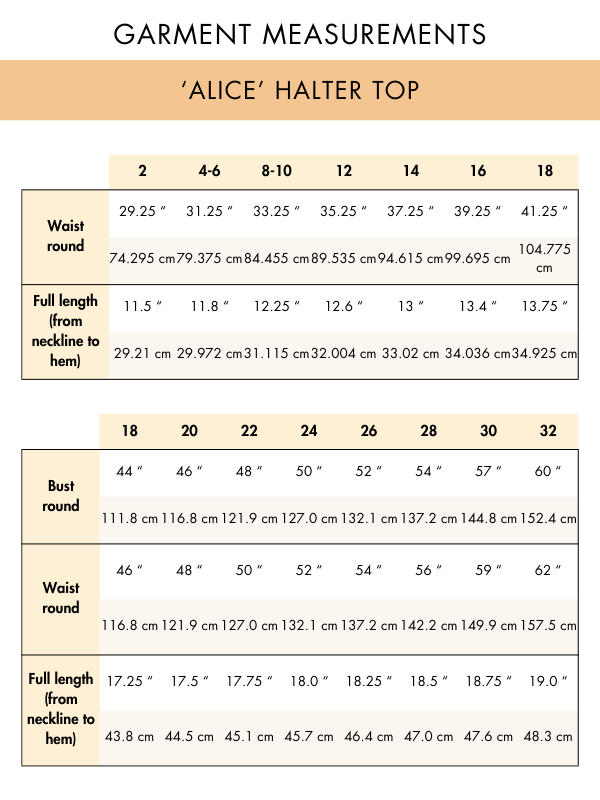 The Alice Halter Top is designed as a warm-weather garment and works best in breathable, lightweight fabrics.