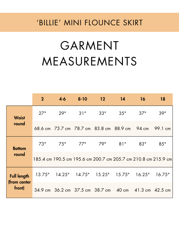 Technical illustration of the Billie Mini Flounce Skirt, showing front and back views for easy sewing reference.
