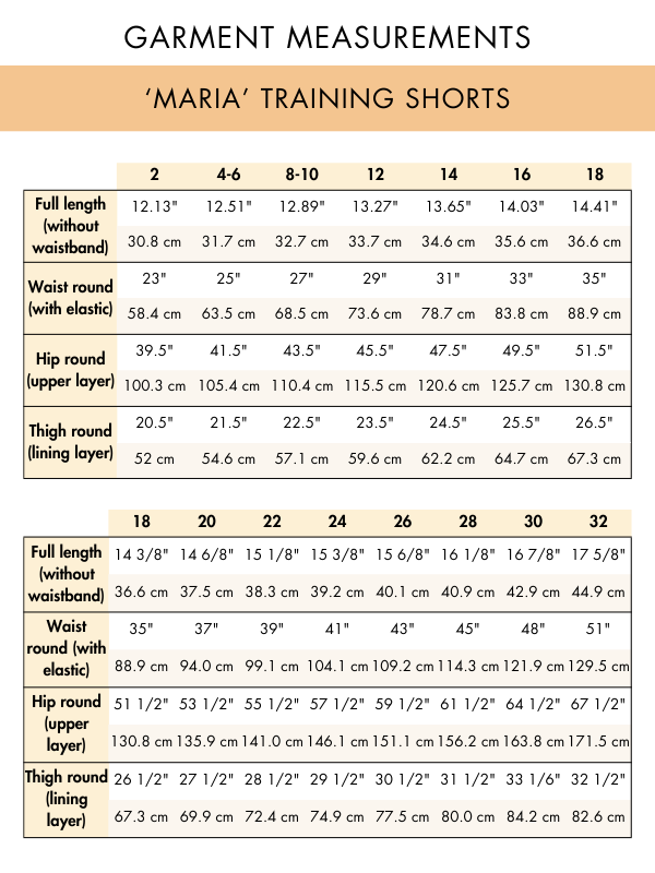 Technical illustration of the 'Maria' training shorts sewing pattern. Shows front and back views with an elastic waistband and relaxed fit.