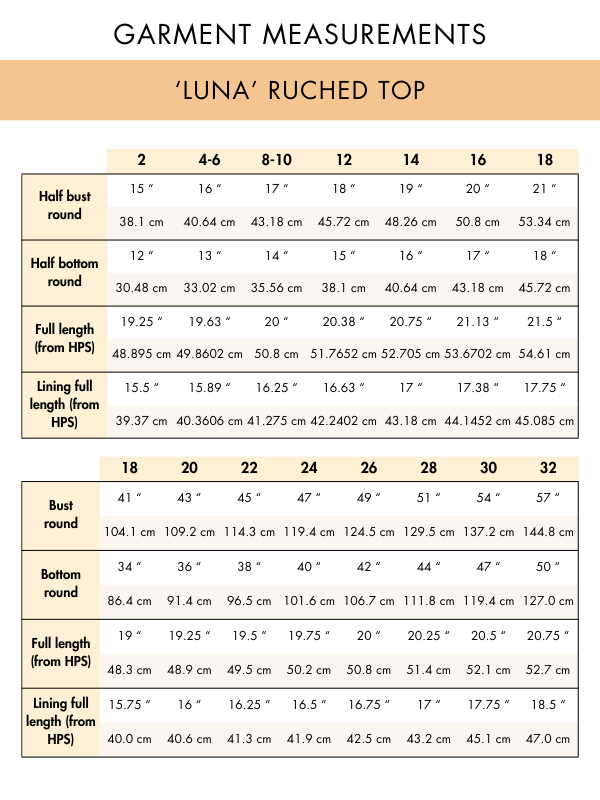 If your measurements fall between sizes, consider the fit you prefer (looser or tighter) and the type of fabric you'll use, as some fabrics have more give. All patterns include finished garment measurements which can be helpful to know how much ease or extra room is built into the design.