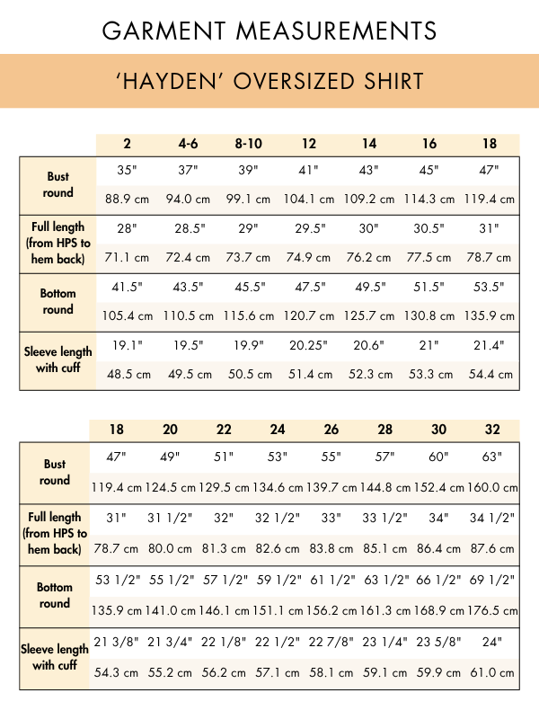 If your measurements fall between sizes, consider the fit you prefer (looser or tighter) and the type of fabric you'll use, as some fabrics have more give. All patterns include finished garment measurements which can be helpful to know how much ease or extra room is built into the design.