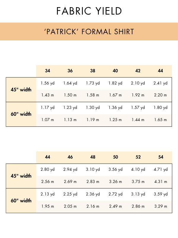 The Men's Formal Shirt Sewing Pattern 'Patrick' comes in a range of sizes. Please refer to the size chart included with the pattern to choose the best fit for your measurements.
