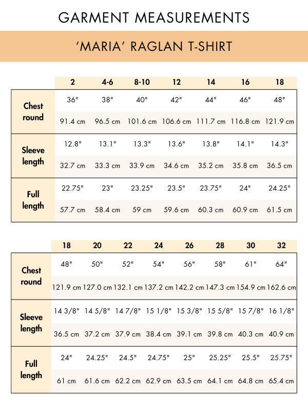 Size guide and fabric recommendations for the 'Maria' Raglan T-shirt sewing pattern. Includes measurements and fabric yardage details.