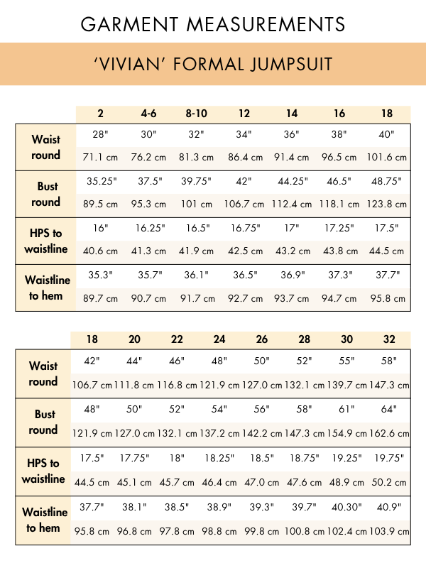 Size guide and fabric recommendations for the Vivian Jumpsuit Pattern. Includes US, UK, and EU sizes with yardage and fabric suggestions.
